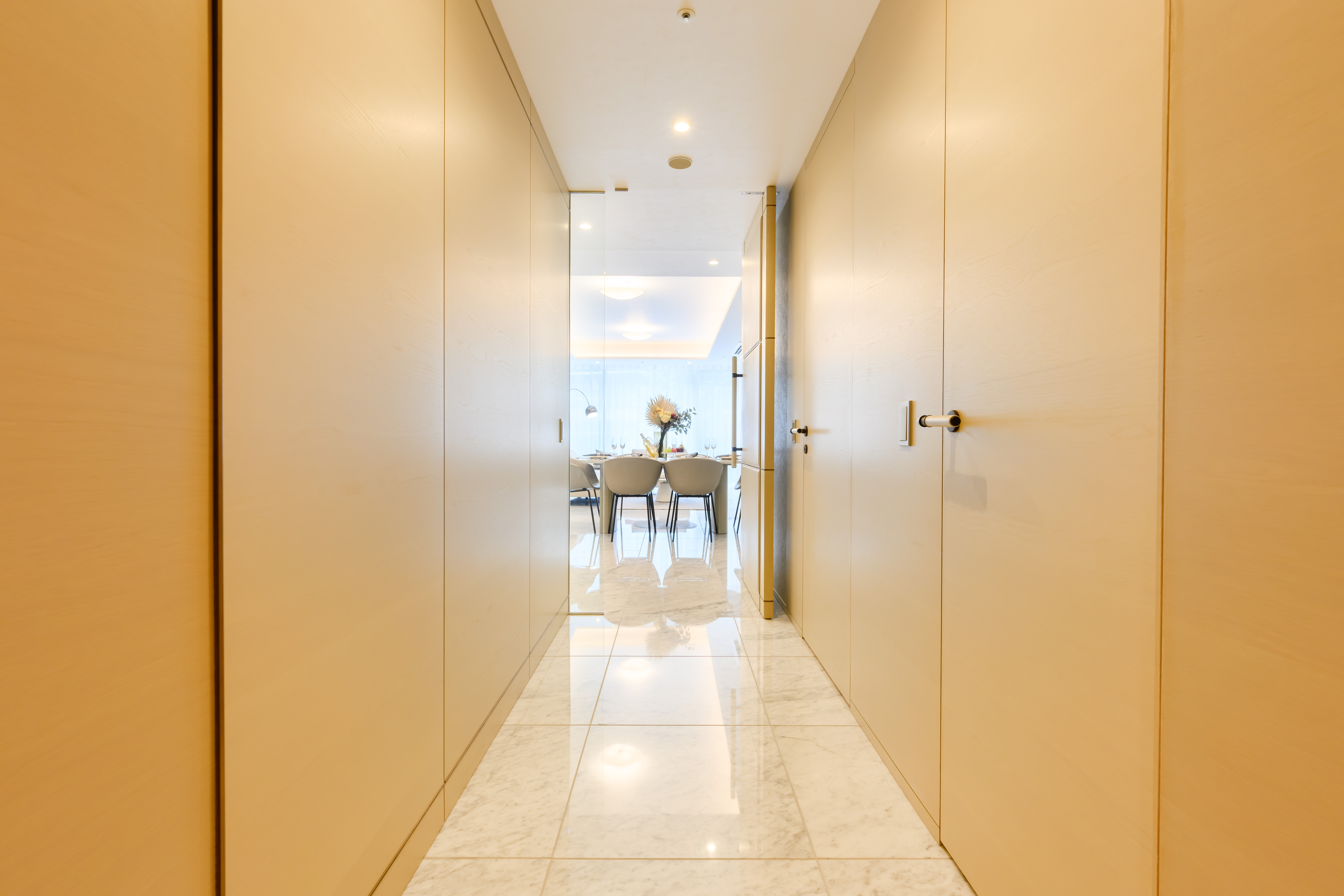 The interior design balances modern sophistication with serene comfort, featuring custom cabinetry, high ceilings, and premium finishes throughout.