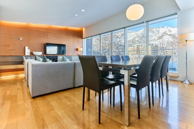 The apartment features a well-proportioned open-plan living and dining area, designed for comfort across all seasons. Interiors were curated by Australian designer Lynn Malone, blending warm alpine materials with clean, contemporary lines.