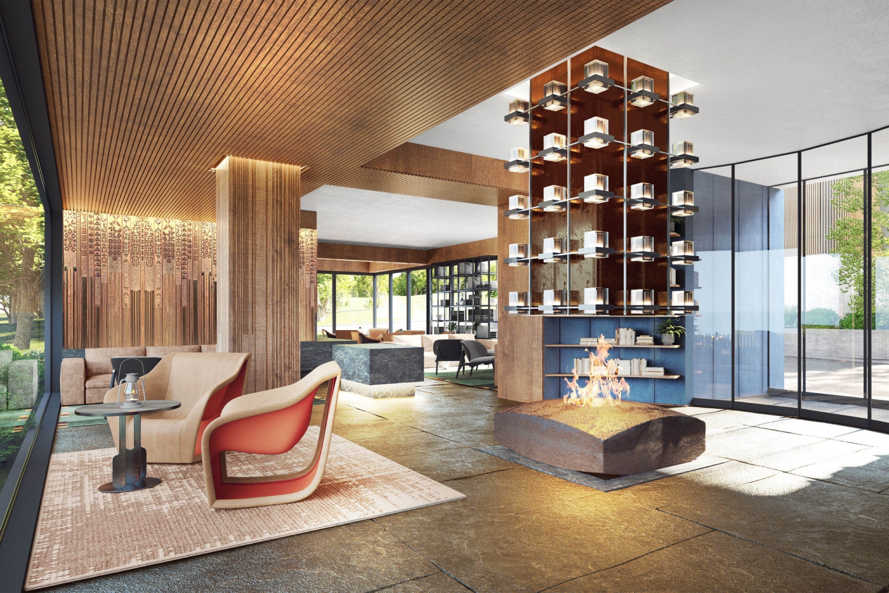 这些别墅由日本顶级建筑事务所野村设计,融合了奢华与宁静。起居室以燃木壁炉为中心,定制的悬挂式躺椅则营造出放松休憩的氛围。